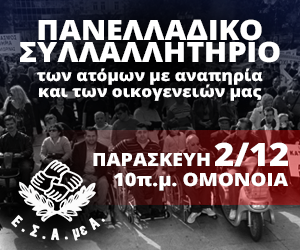 Ενόψει της 3ης Δεκέμβρη, Εθνικής Ημέρας ΑμεΑ, η Εθνική Συνομοσπονδία Ατόμων με Αναπηρία διοργανώνει πανελλαδικό, παναναπηρικό συλλαλητήριο στις 2 Δεκέμβρη, στις 10 το πρωί στην Ομόνοια, για να ακολουθήσει πορεία στη Βουλή.