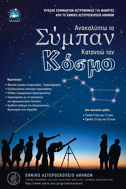 Το Εθνικό Αστεροσκοπείο Αθηνών όπως κάθε χρόνο έτσι και φέτος, διοργανώνει κύκλο σεμιναρίων Αστρονομίας για Παιδιά και Εφήβους στο Κέντρο επισκεπτών Πεντέλης με τίτλο: