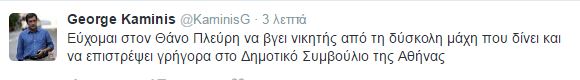 Τις ευχές του στον Θάνο Πλεύρη «να βγει νικητής από τη δύσκολη μάχη που δίνει» έστειλε ο δήμαρχος Αθηναίων Γιώργος Καμίνης μέσω του λογαριασμού του στο twitter.