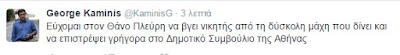 «Εύχομαι στον Θάνο Πλεύρη να βγει νικητής από τη δύσκολη μάχη που δίνει και να επιστρέψει γρήγορα στο Δημοτικό Συμβούλιο της Αθήνας» έγραψε ο κ. Καμίνης.