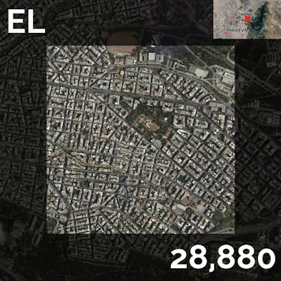 Στην περίπτωση της Ελλάδας, μάλιστα προκύπτει από τα στοιχεία πως στην πιο πυκνοκατοικημένη περιοχή της Αθήνας ζουν 28.880 άνθρωποι ανά τ. χλμ. και εντοπίζεται γύρω από την πανεπιστημιούπολη Ζωγράφου.