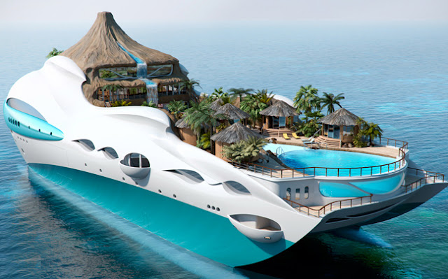 Το σκάφος μοιάζει με απομονωμένο, ηφαιστειογενές νησί, με τις τροπικές παραλίες του και καλύβες που μπορούν να φιλοξενήσουν έως δέκα άτομα. Το σχεδίασε η βρετανική εταιρεία Yacht Island Deigns.