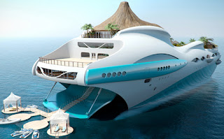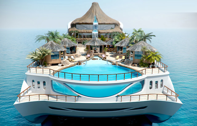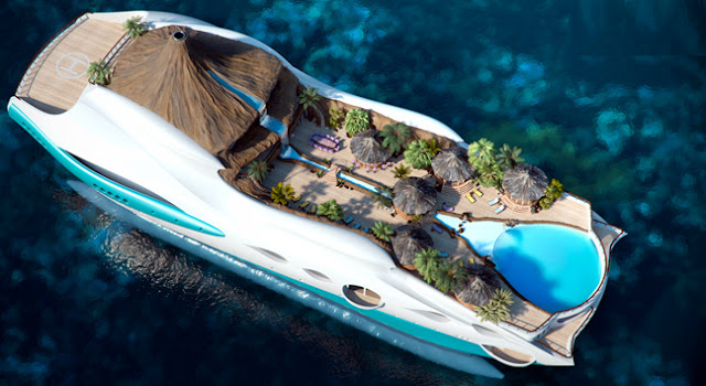 Το σκάφος μοιάζει με απομονωμένο, ηφαιστειογενές νησί, με τις τροπικές παραλίες του και καλύβες που μπορούν να φιλοξενήσουν έως δέκα άτομα. Το σχεδίασε η βρετανική εταιρεία Yacht Island Deigns.