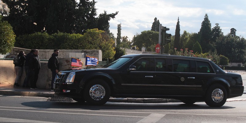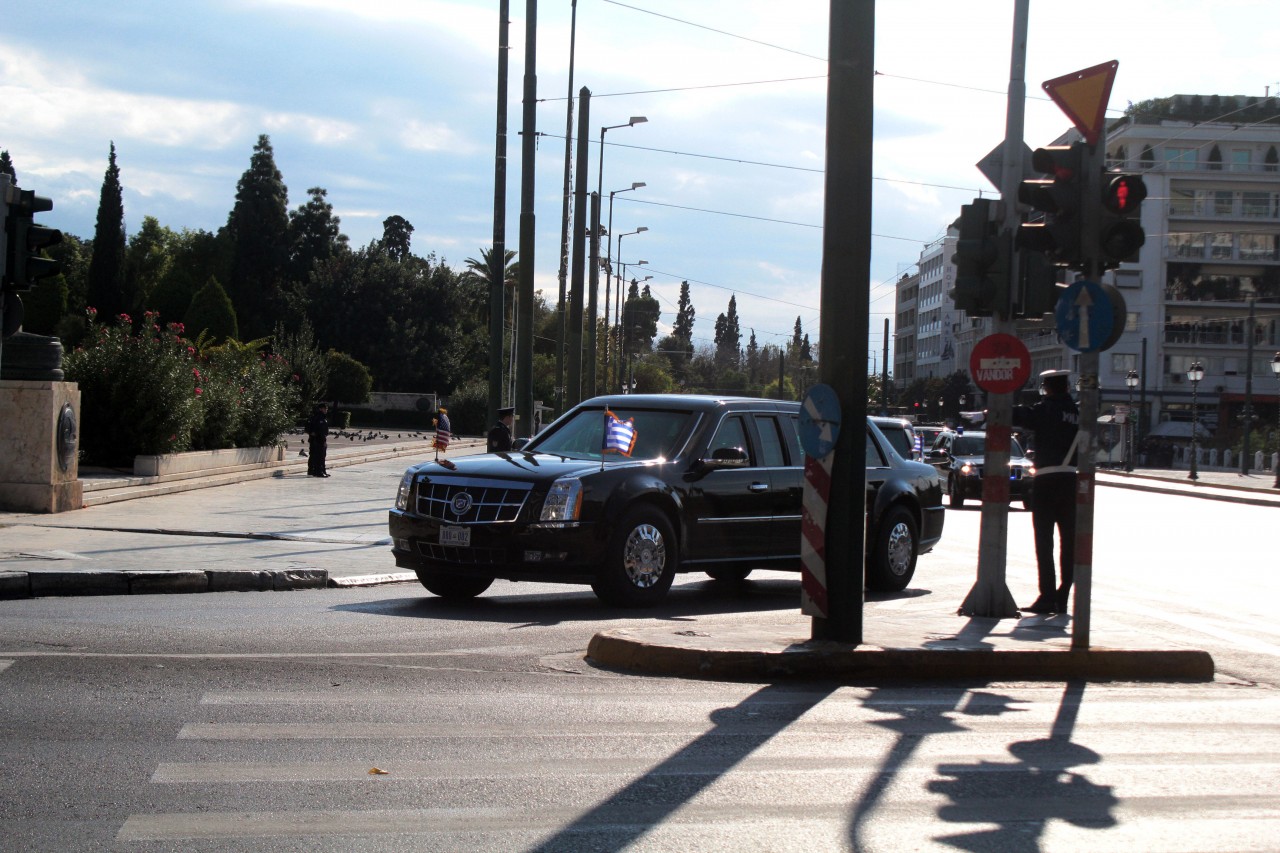 Άκρως εντυπωσιακές είναι οι εικόνες με τη θωρακισμένη λιμουζίνα του Μπαράκ Ομπάμα, το επονομαζόμενο «Θηρίο», να κινείται στους αθηναϊκούς δρόμους.