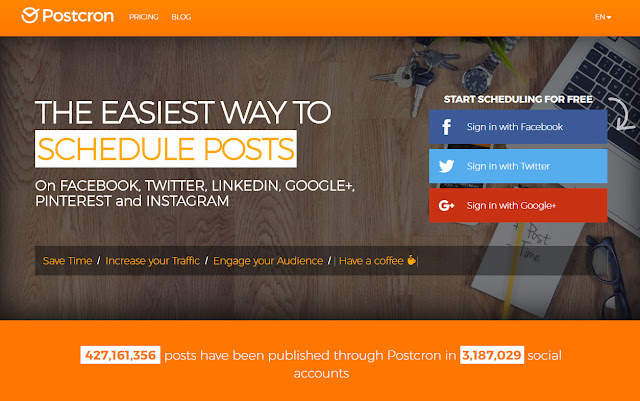 ΒΗΜΑ 1: Για να κάνετε εγγραφή πάτε στο postcron.com και συνδέεστε με τον λογαριασμό σας του facebook, του twitter η του google+. Να θυμάστε πρώτον πως την πρώτη φορά θα σας ζητηθεί να αποδεχθείτε τα δικαιώματα δημοσίευσης και δεύτερον να επιλέξετε το “κοινό” ώστε να μπορούν να δούν οι επαφές σας τις αναρτήσεις σας.