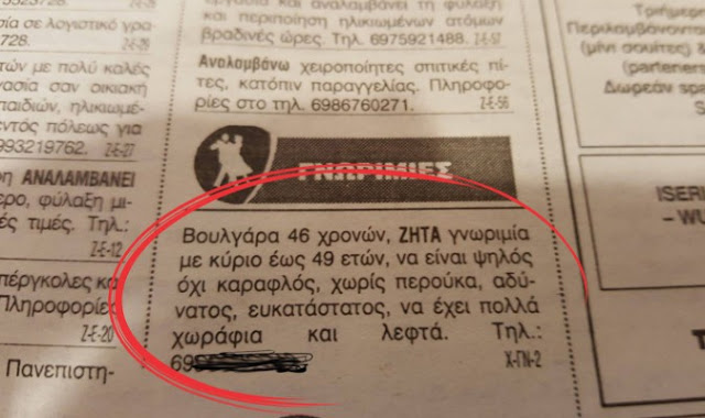 Δεν υπάρχει η αγγελία που δημοσιεύτηκε σήμερα σε τοπική εφημερίδα των Τρικάλων…